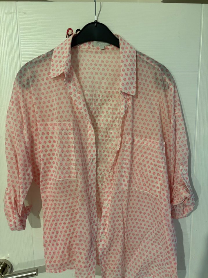 Pembe pastel tonlarda, pamuklu kumaştan, düğmeli ve V yakalı, rahat kesim kadın gömleği.