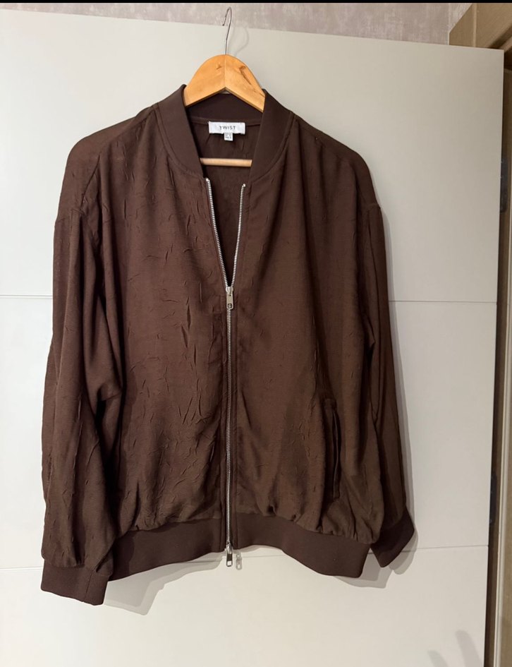 Kahverengi bomber ceket, fermuarlı, uzun kollu ve yüksek yakalıdır. Bol kesim ve minimalist, desensiz tasarımı günlük kullanıma uygundur. Bir kere kulanıldı xs ,s ,m bedene kadar uyumludur .bir kere kullanılmıştır