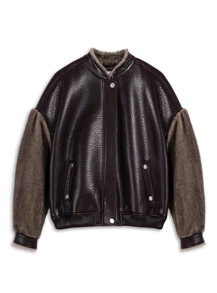 Kahverengi deri ceket, kürklü uzun kollu ve yuvarlak yakalıdır. Salaş kesim ve midi uzunluktadır, sokak modasına uygundur.