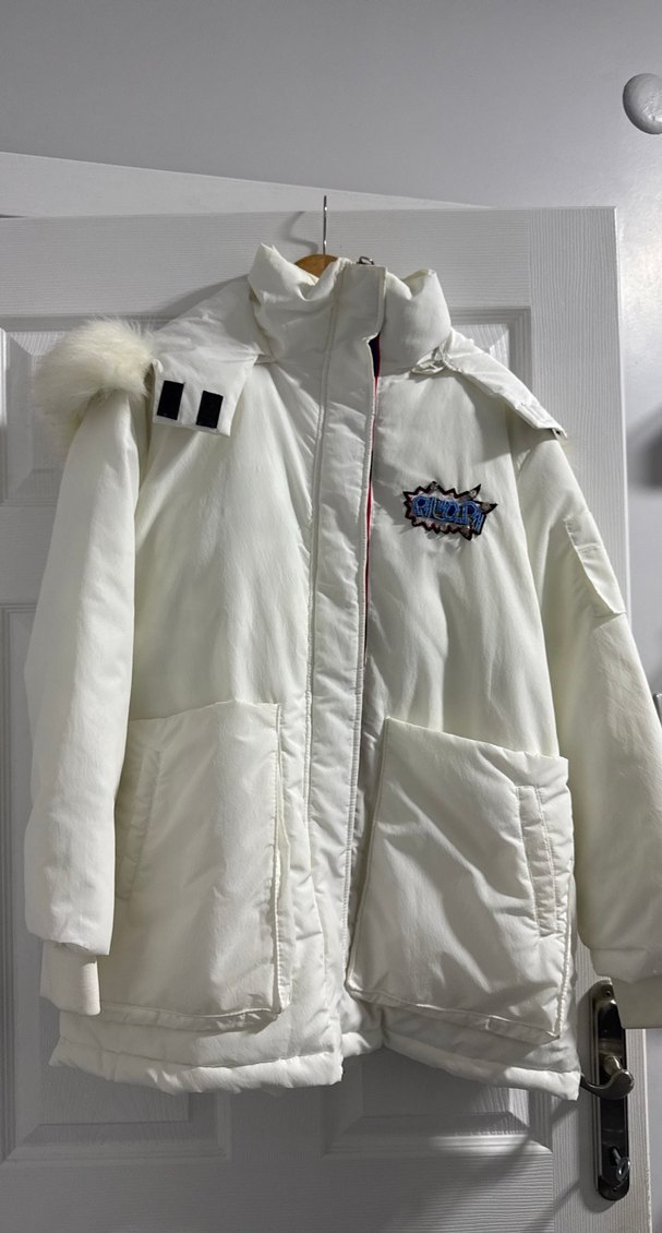 boyun kısmında beklediği için sararma mevcut ama kurutemizleme ile çıkar . Çok kalın bir mont . Fermuarlı, yakalı ve uzun kollu beyaz kadın ceketi, midi boyda ve sokak stiline uygun. Yumuşak, sıcak kumaştan üretilmiştir, cepleri ve aplik detayları vardır.