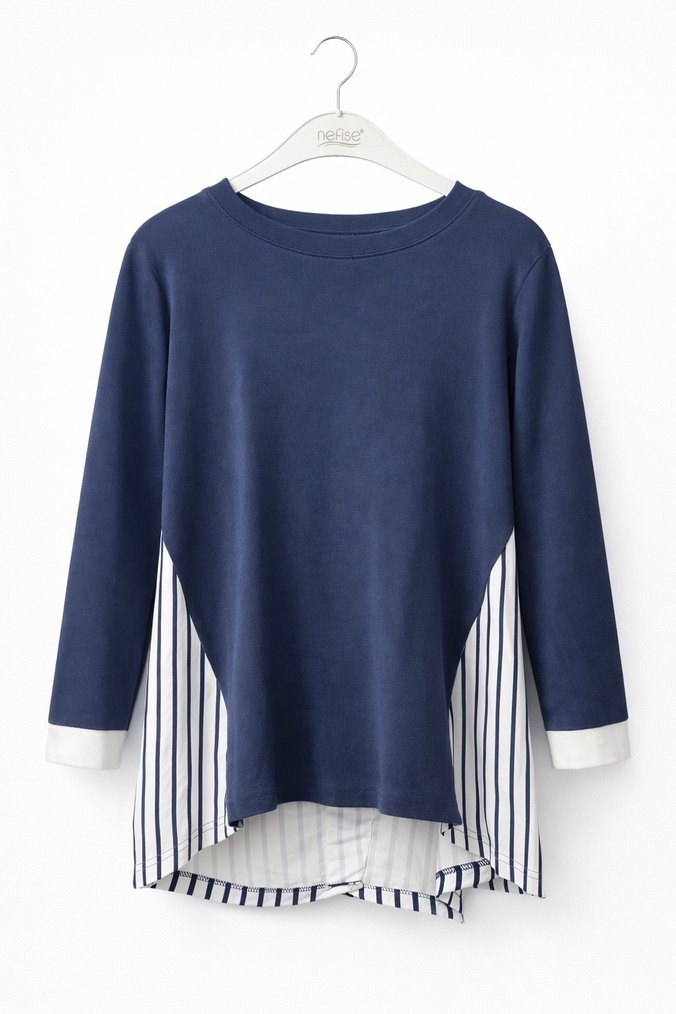 Uzun kollu, yuvarlak yakalı ve bol kesim bluz. Mavi pamuk kumaş ve arkada gri pileli çizgili detaylar içerir. Günlük rahat ve şık bir tercih. S M uygundur