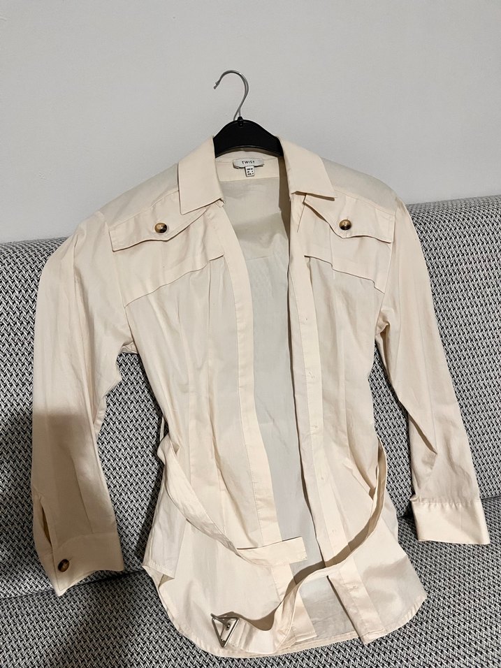 Uzun kollu, keten kumaştan yapılmış krem rengi gömlek. Midi boydadır. Xs bedendir fakat S beden olanlara rahatlıkla olacaktır. Deformasyonu yoktur. TWIST 2022 Kış sezonu ürünüdür.