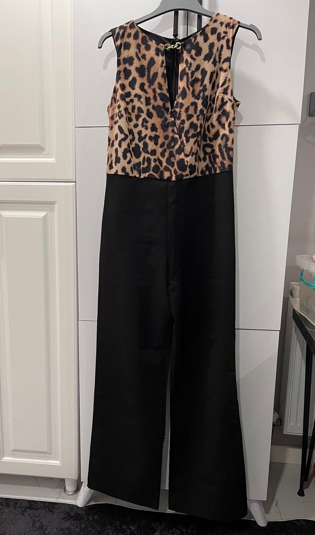 Kolsuz ve V yaka, leopar desenli üst kısmı olan kadın tulumu. Bel kemerli, regular fit ve uzun siyah pantolonlu, ofis için uygun.