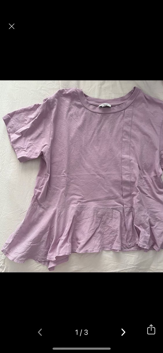 Lila pastel renkte, kısa kollu, etek kısmı detaylı, bol kesim kadın bluz. Etek kısmında fırfır detayıyla sade ve rahat bir görünüm sunar.