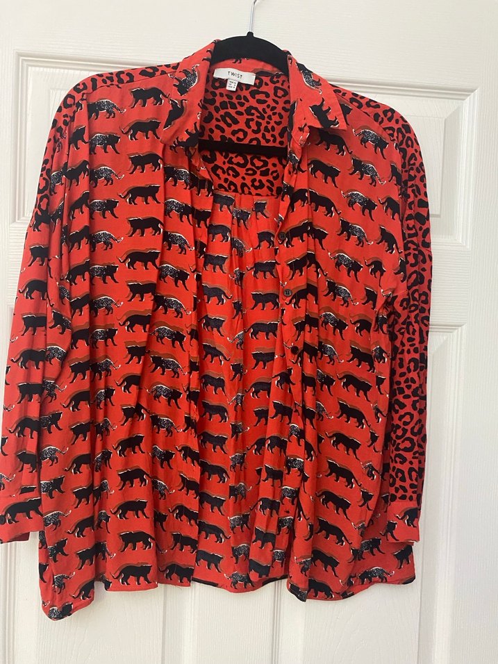 Twist marka 36 beden Uzun kollu, bol kesim kırmızı kadın gömleği. Leopar ve panter desenli, yaka detaylı, bohem-retro tarzda dış mekan kullanımı için uygun.