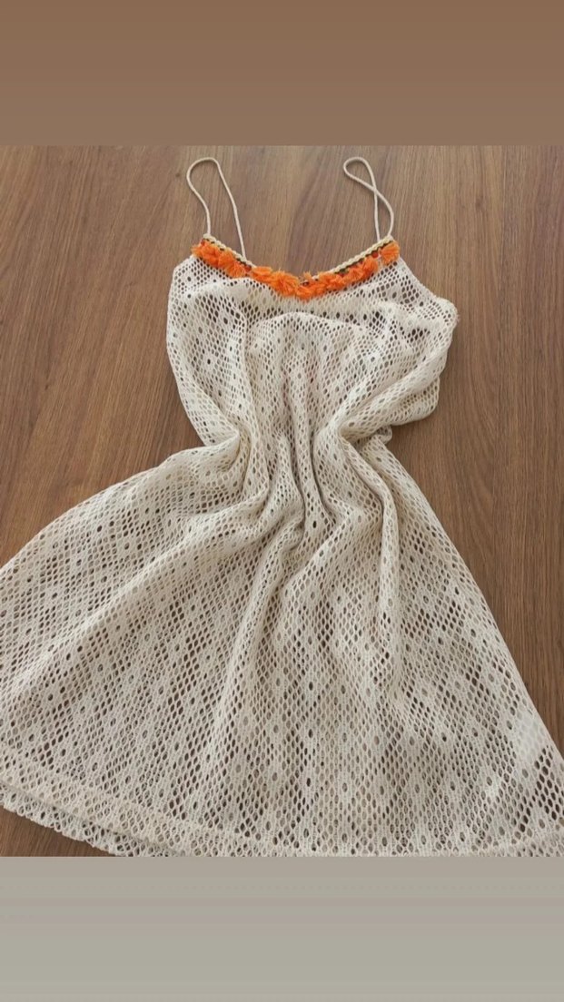 Nakışlı detaylı, dantelli, V yakalı ve ince askılı beyaz örme elbise. Bol kesim ve uzun boy, plaj için uygun. ️