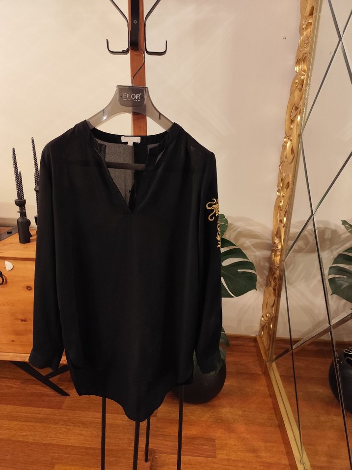 Siyah, uzun kollu ve V yakalı, bol kesim bluz. İpeksi şifon kumaş, drapeli ve baskılı detaylara sahip, özel günlerin kurtarıcısı. 36 beden