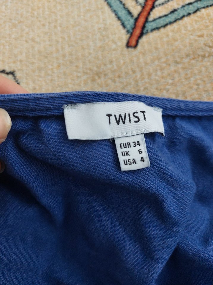 Twist markalı, düğmeli,cepli, kol uçları lastikli mavi elbise, kot kumaşı gibi, normal midi boyda, sokak stili ve rahatlığı sunar.