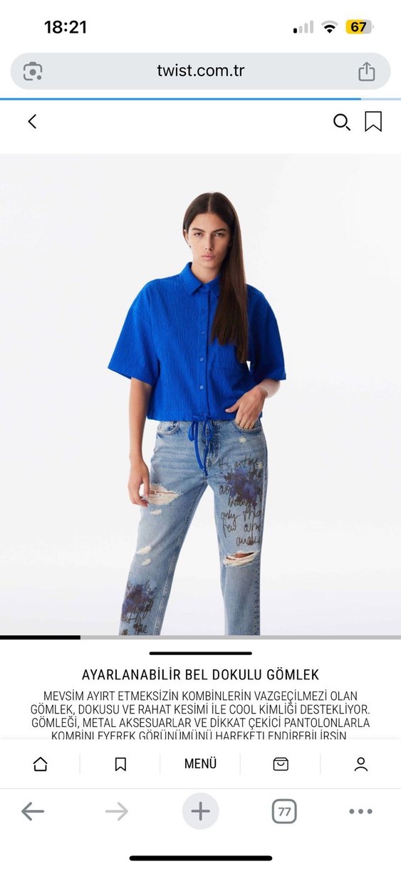 Mavi keten, düğmeli, kısa kollu, bol kesim gömlek. Parlak kumaşıyla gündelik bohem tarzını yansıtır. Bel kısmı bağlamalıdır.