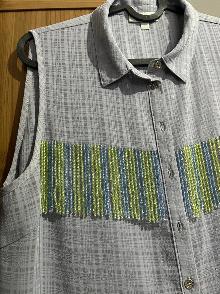 Gri renkte, uzun kollu olmayan, düğmeli ve yakalı gömlek. Mavi ve yeşil çizgili nakış detayları vardır. Rahat kesim ve uzun boy, günlük kullanıma uygundur.
