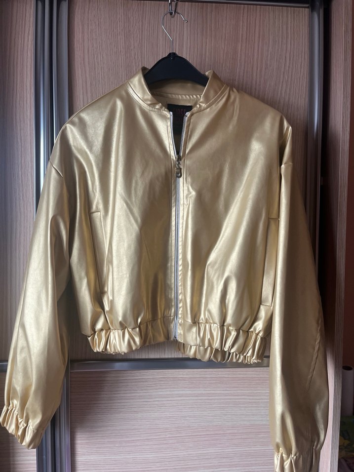 Parlak altın renkli, uzun kollu, yüksek yakalı, fermuarlı kısa deri mini ceket. Kadınlara özel, şık ve sokak tarzına uygun.
