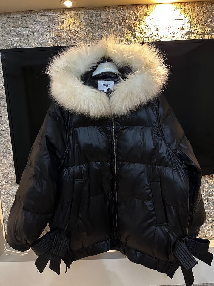 Kürklü kapüşonlu, kısa boy, askılı kollu siyah kış ceketi, şık ve rahat sokak stili için uygundur.