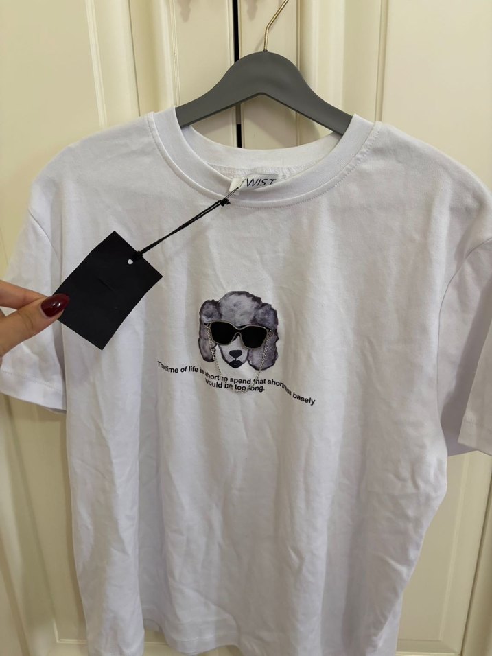Pamuklu beyaz kısa kollu, oversize kesim, güneş gözlüklü köpek baskılı tişört. Yuvarlak yaka ve kısa boyuyla rahat ve trend bir görünüm sağlar.