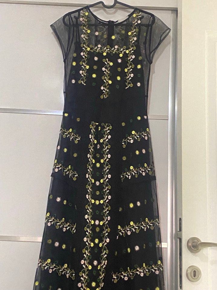Karanlık renkli sentetik kumaştan, nakışlı çiçek desenli, kolsuz uzun elbise. V yakalı, vücuda oturan ve drapeli bohem tarzda düğün elbisesi.