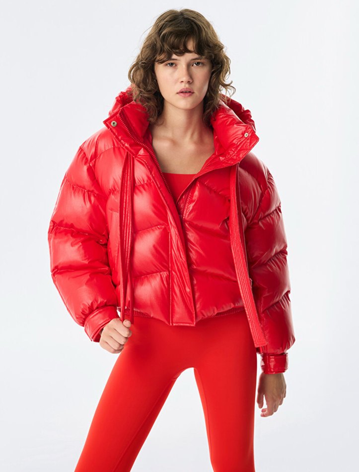 Parlak kırmızı, şişme ve mini uzunlukta kadın kışlık mont. Yüksek yakalı, dar kesim ve askılı kollu, sentetik kumaştan spor ve sokak stili için uygun. ❄️