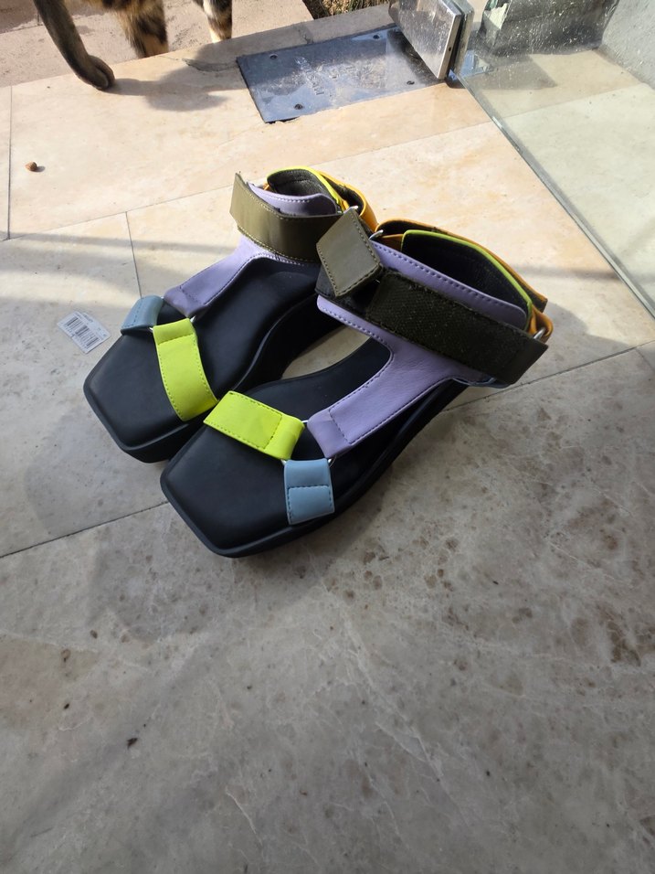 Pastel çok renkli bantlara ve tokalı kapanışa sahip dolgu topuklu kadın sandaletleri. Dış mekan sokak modasına uygun, rahat ve dayanıklı kauçuk malzemeden yapılmıştır.