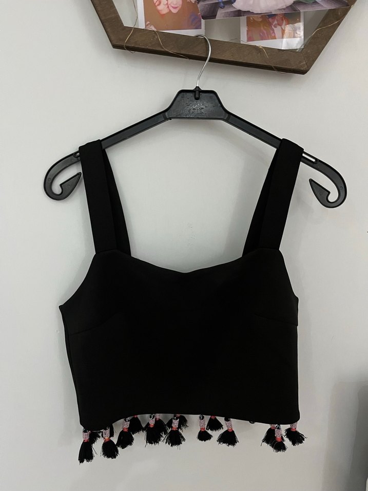 Geniş askılı, püsküllü detaylı siyah mini büstiyer. Halter yaka ve koyu batik deseniyle sokak stiline uygun. Bir önden bir de arkadan birer püsküllü yok