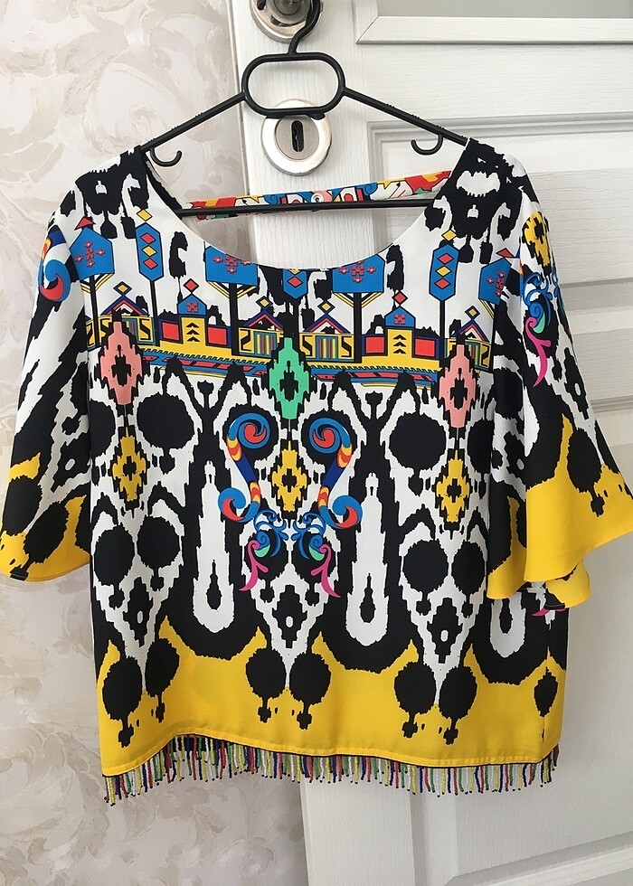 Twist renkli boncuk detaylı sırt dekolteli bluz sütyen kadar dekoltesi var. Boncuklarda eksik yok hepsi sağlam. Rahat kalıp olduğu için s ve m bedene de olur diye düşünüyorum. Beyaz pantolonla çok şık duruyor