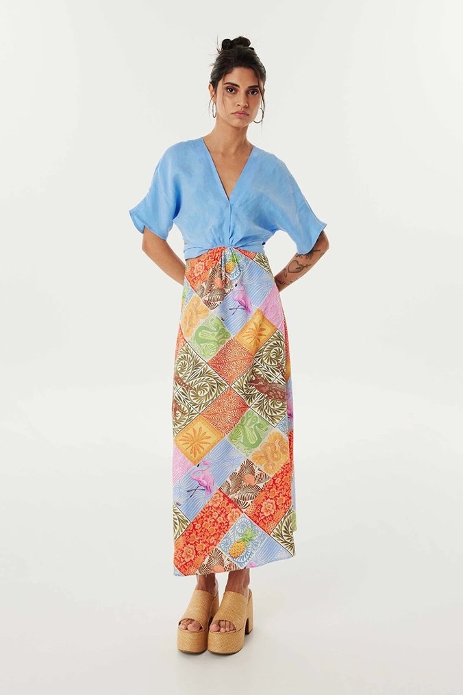 Bohem tarzda, V yakalı ve kısa kollu, bol kesim uzun elbise. Yumuşak kumaş ve pastel çok renkli batik desenlidir.
