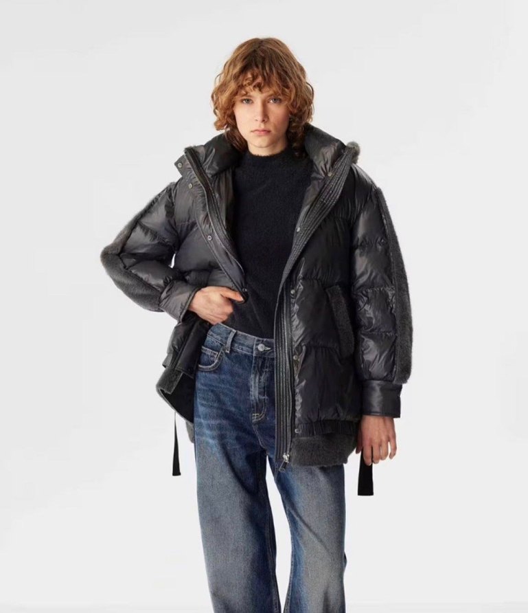 Siyah denim ceket, yüksek yakalı ve uzun kollu. Salaş kesim ve kemerli bel detayına sahip. Midi boyda, desensiz, günlük kullanıma uygun.