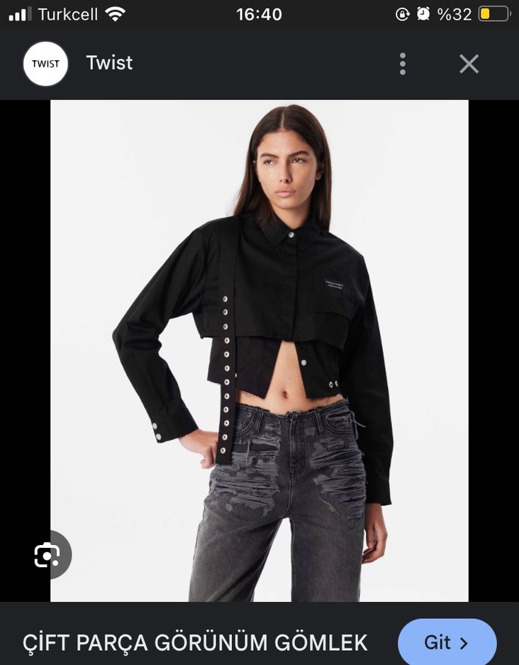 Twist markalı siyah renkli, kısa kesim, uzun kollu siyah gömlek. Düğmeli ve kesimli yaka detayına sahip, günlük kullanıma uygun şık parça. içi crop üstü gömlek 2 parçadan oluşmaktadır
