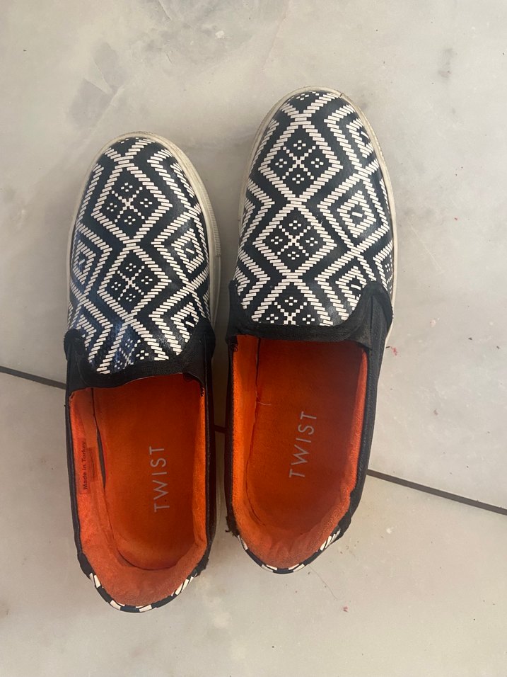 espadrilleri, siyah-beyaz geometrik desenli, pileli detaylı ve günlük kullanım için kauçuk tabanlıdır.