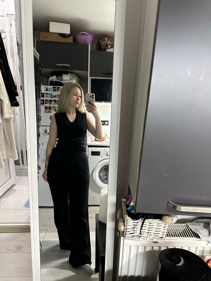 Denim kumaştan, kolsuz ve V yakalı, siyah, midi uzunlukta, vücuda oturan kadın tulumu. Ofis için rahat ve şık bir tercih.