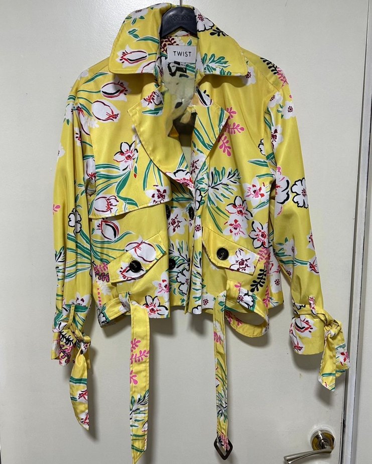 Sarı renkli, çiçek desenli ceket. Düğmeli, yakalı ve bağcıklı kollara sahip, bol kesim vintage tarzda günlük kullanıma uygun.