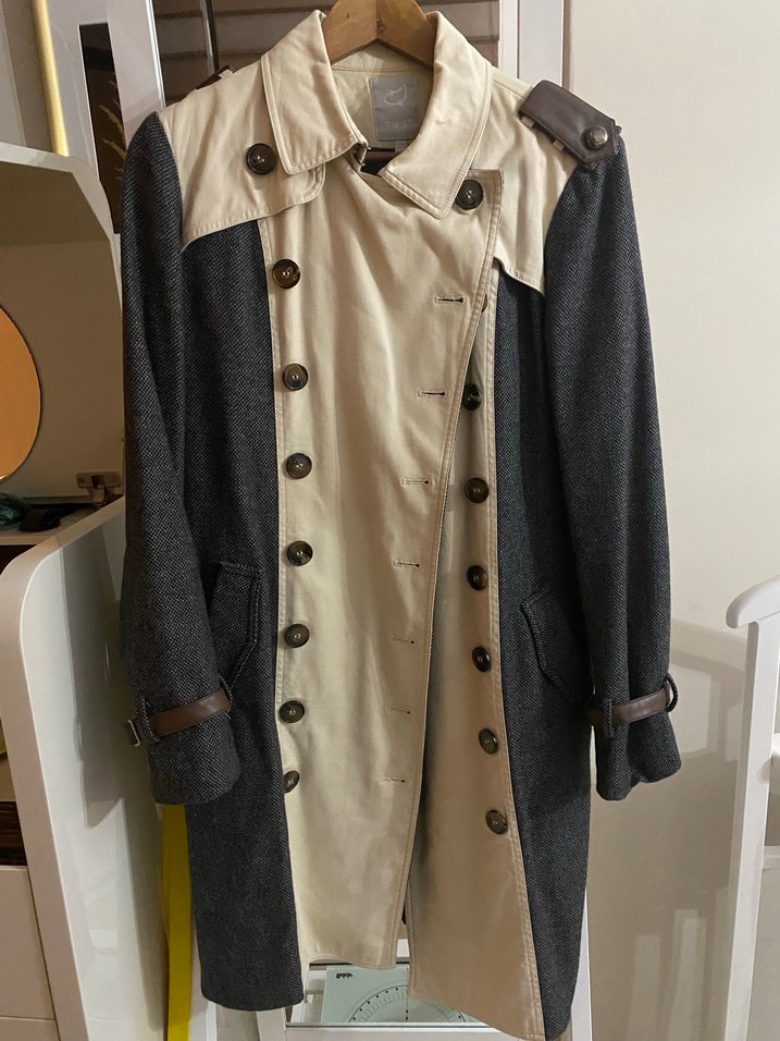 Kadınlar için düğmeli, bej kumaş kombinli midi trençkot. Notlu yaka ve uzun kollu, günlük kullanıma uygun şık Paris tarzı.
