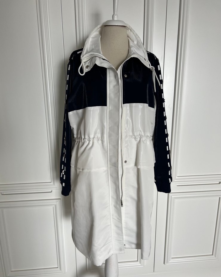 Beyaz lacivert fermuarlı belden büzgülü ayarlanabilir trençkot etiketli yeni Uzunluk 92 Kolaltı 58 cm