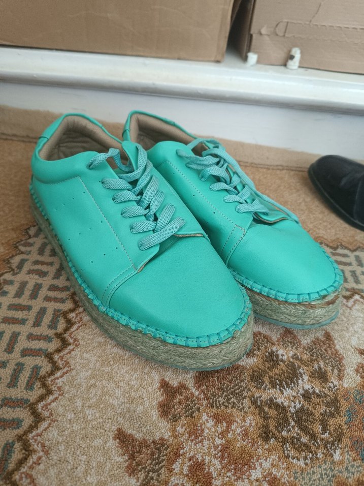 Turkuaz renkli, dolgu topuklu kadın espadrilleri, kauçuk taban ve düz yüzeyiyle bohem tarzını athleisure rahatlığıyla birleştiriyor. 38 numara twistten alındı yazın vazgeçilmezi