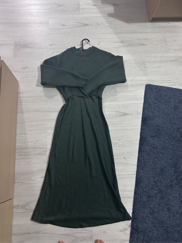 Yüksek yakalı, drapeli ve uzun kollu yeşil elbise. Minimalist ve vücuda oturan kesimiyle günlük kullanıma uygundur.