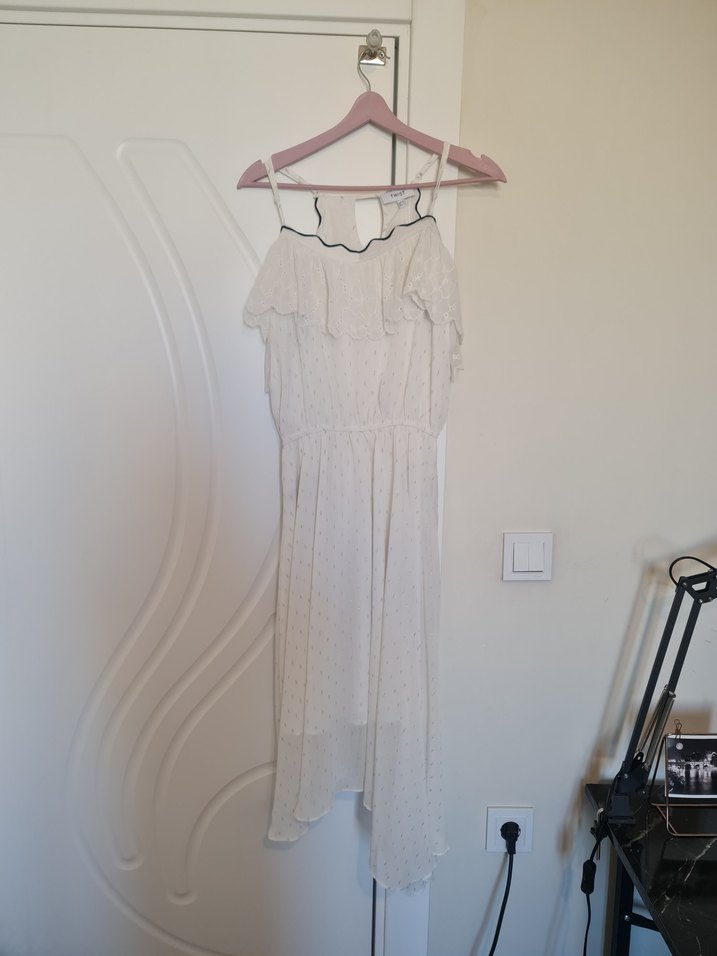 İnce askılı, V yakalı, bol kesim uzun beyaz keten elbise, fırfır detaylı. Bohem tarzda, günlük kullanıma uygun. 2 kere giyildi. bir sorunu yok esnektir beli.