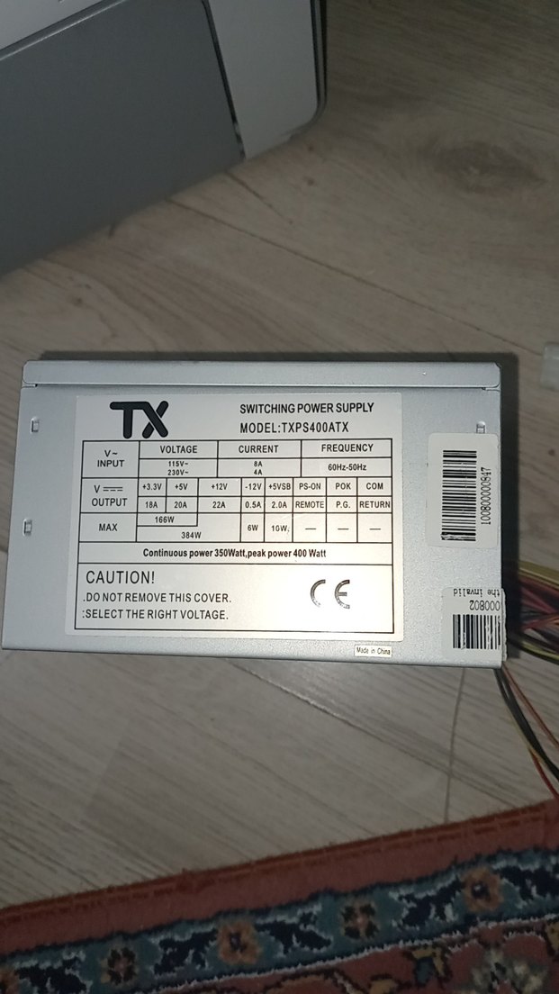 TX 400W güç kaynağı, gri ve beyaz kasasında çoklu voltaj çıkışları ve güvenlik uyarıları içerir. Sürekli 350W, tepe 400W güç sağlar. ⚡