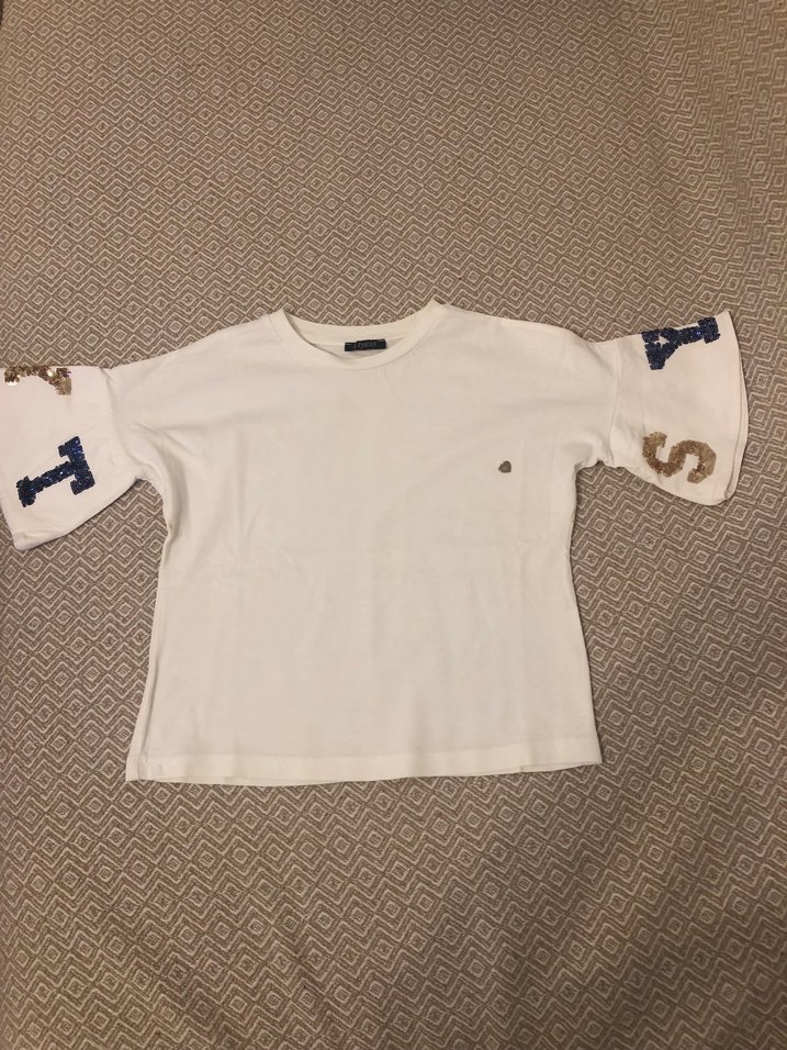 Krem renkli, pamuklu kız çocuk tişörtü, kısa kollu ve yuvarlak yaka. Salaş kesimi ve baskılı detaylarıyla rahat ve trend bir tarz sunar. Hiç kullanılmadı dolap bekledi kolları pul payet işlemeli
