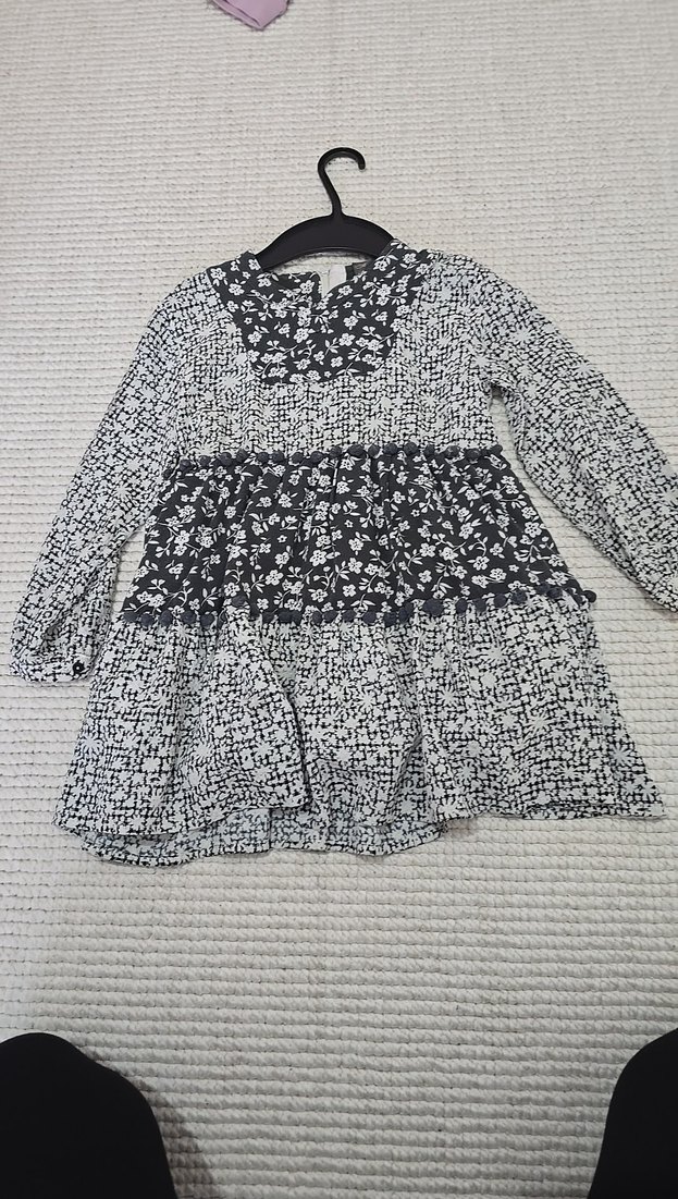 Gri renkte, uzun kollu, yakalı ve bol kesim kız elbisesi. Bohem tarzda, desenli kumaş ve fırfır detayları içerir.