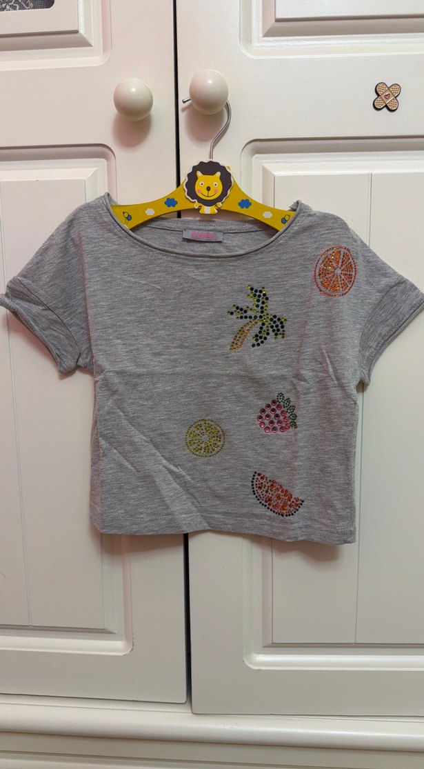 Gri renkli, kısa kollu ve yuvarlak yakalı kız çocuk tişörtü, payetli meyve baskılarıyla süslenmiştir. Yumuşak tekstil kumaştan üretilmiş, rahat kesimlidir.