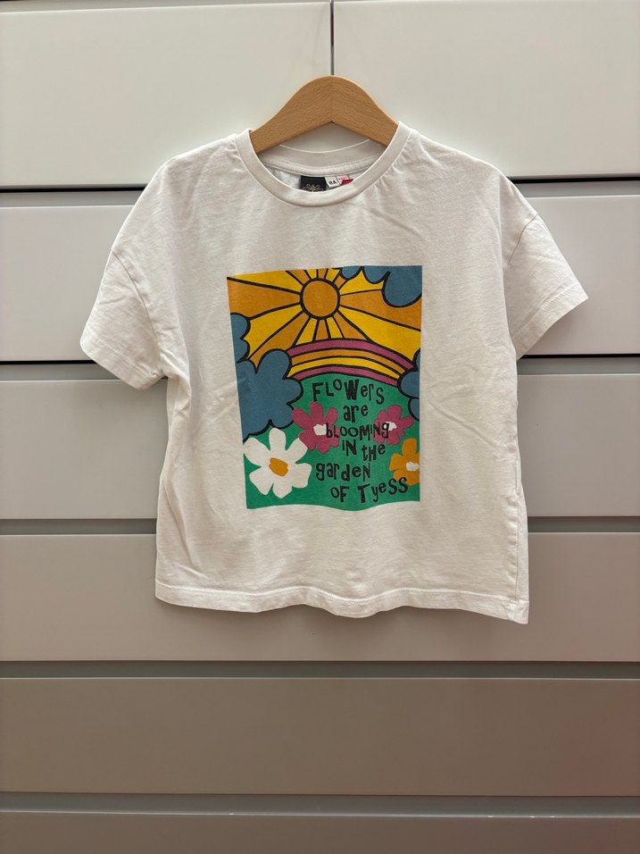 Tyess kız çocuk t-shirt (8 yaş) Pamuklu beyaz tişört, renkli baskılı, kısa kollu ve yuvarlak yakalıdır. Salaş kesimiyle bohem, hippie ve retro tarzı yansıtır.