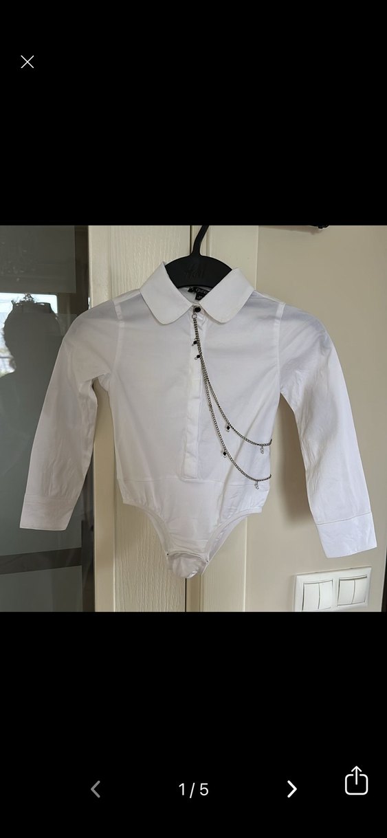 Pamuk kumaştan yapılmış, yakalı ve uzun kollu, ön kısmında zincir detayları bulunan, vücuda oturan beyaz kız çocuk gömlek body.