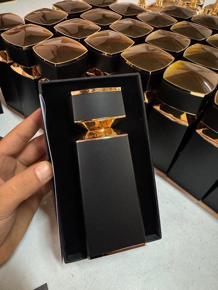Minimalist stil, koyu altın ve siyah renklerde, çağdaş tasarımlı erkek parfümü. Şık ve modern görünüme sahip.