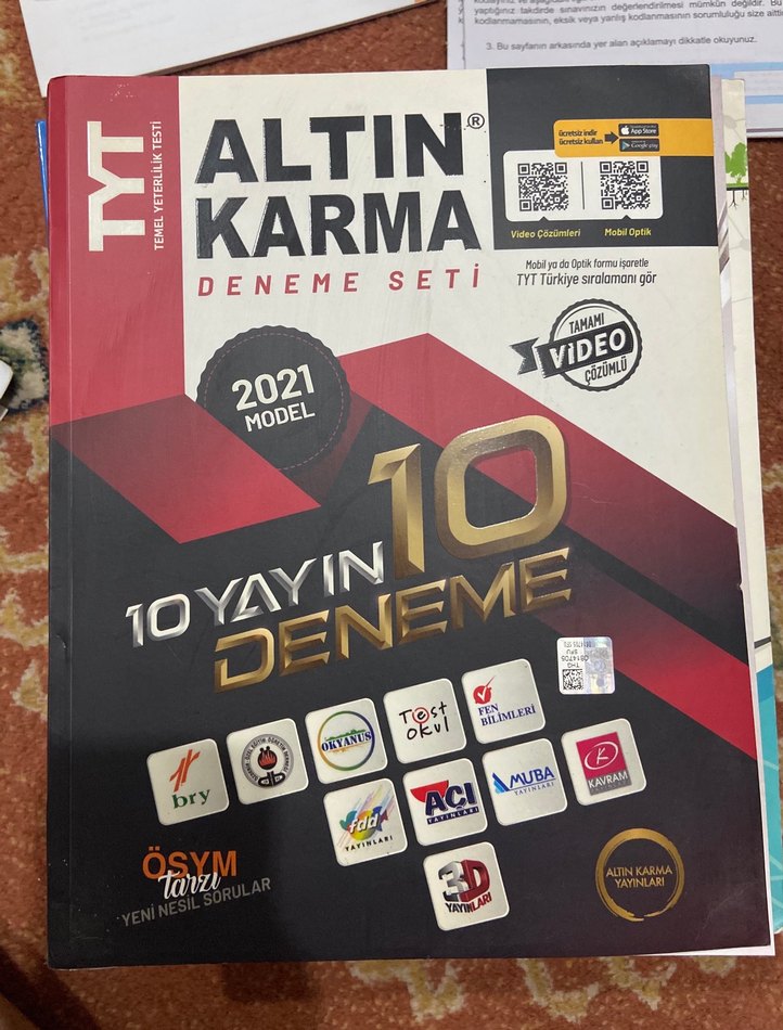 2021 model TYT Altın Karma deneme seti, 10 farklı deneme ve video çözümleri ile birlikte gelir. Mobil optik desteği de vardır. 6 deneme mevcuttur. Fen Bilimleri, Özdebir, Muba, Açı, 3D, Testokul Yayınlarını içermektedir. Cevap anahtarları ve optikler içindedir.