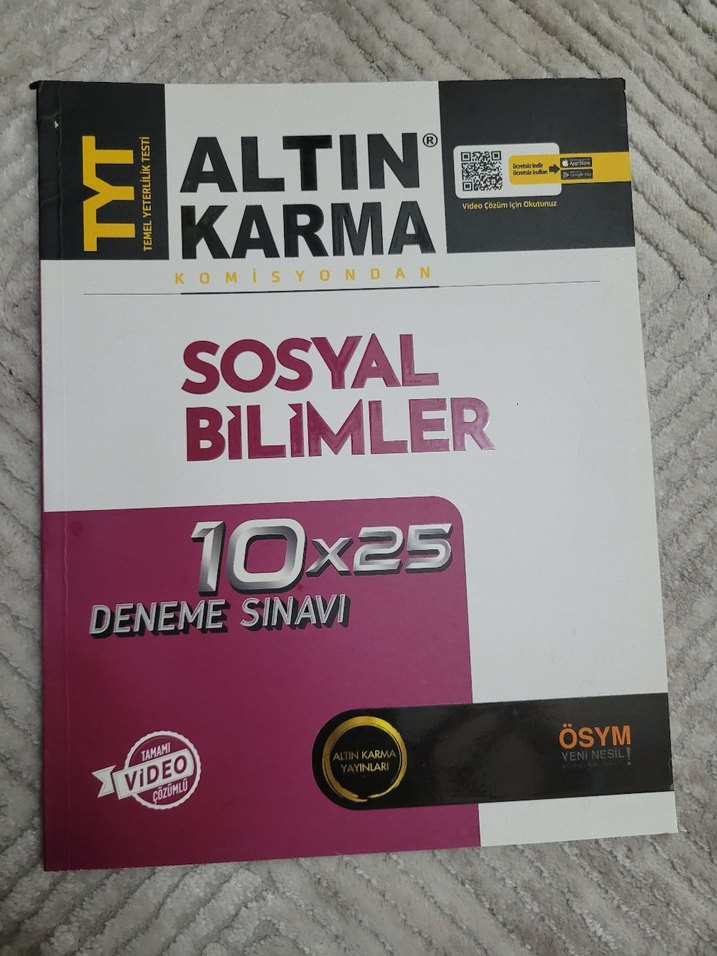 TYT Altın Karma Sosyal Bilimler kitabı, 10x25 deneme sınavı ve video çözümleri içerir. ÖSYM standartlarına uygundur ve sınav hazırlığında destek sağlar. İlk 2 deneme cözüldü geri kalanı temiz