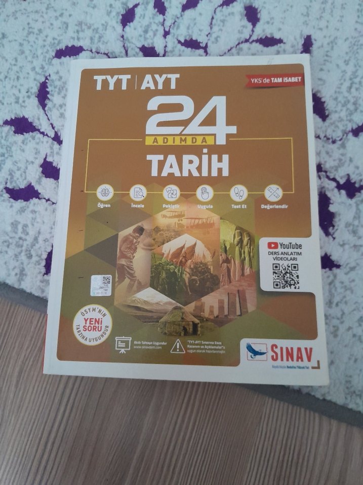 TYT AYT 24 Adımda Tarih sınav kitabı, soru, özet ve testlerle yapılandırılmış çalışma sunar. QR kodla video dersleri içerir. çözümlü