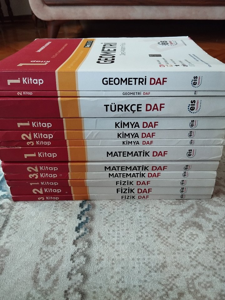 Hepsini toplam 150 ye veriyorum. 2021 basımdır.Çoğunun 2,3 föyü çözülmüş sadece kimya çözülü Geometri, Türkçe, Kimya, Matematik ve Fizik konularını içeren DAF sınav hazırlık kitapları seti.