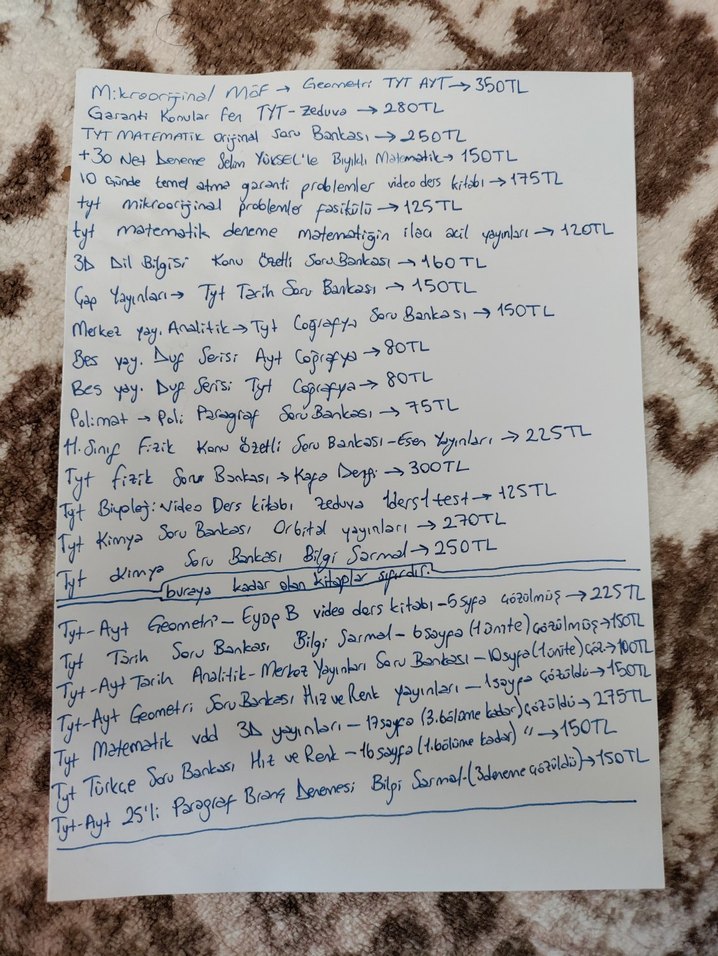 TYT ve AYT geometri, matematik ve ilgili konulara ait çeşitli kitapların fiyatlarıyla birlikte el yazısıyla yazılmış listesi. ilgilenenler yazabilir ona göre tek tek ilan açarım