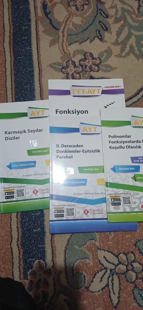 TYT-AYT sınavlarına yönelik fonksiyon, parabol, polinomlar, diziler, eşitsizlikler, karmaşık sayılar ve koşullu olasılık konularını içeren soru kitapları seti.