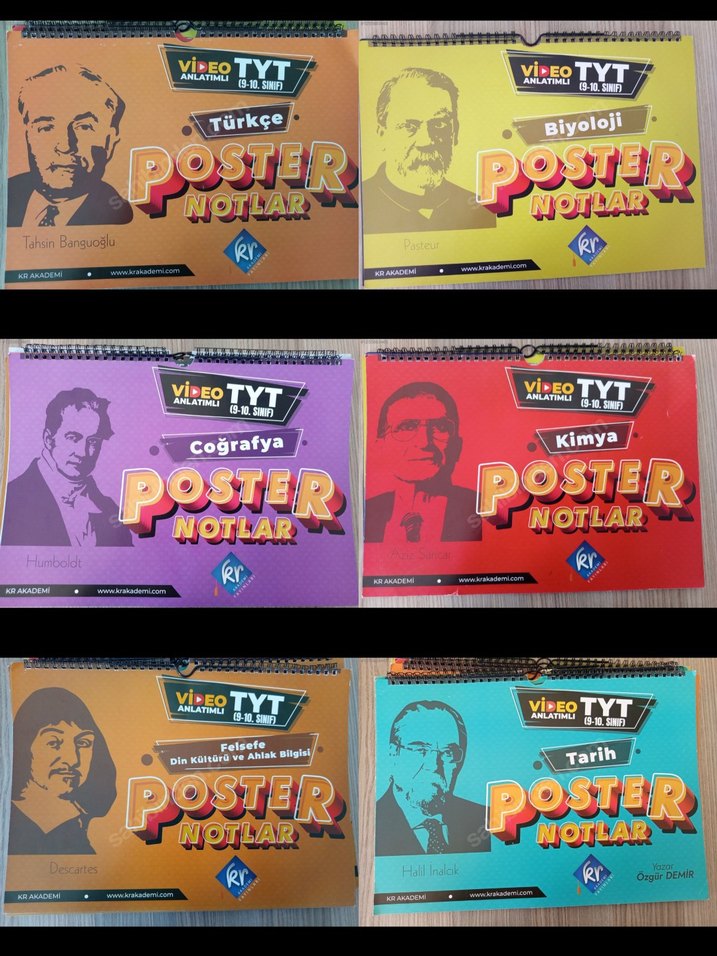 Türkçe, Biyoloji, Coğrafya, Kimya, Felsefe ve Tarih konularını içeren TYT poster notlar seti. Video anlatımlı destek içerir.