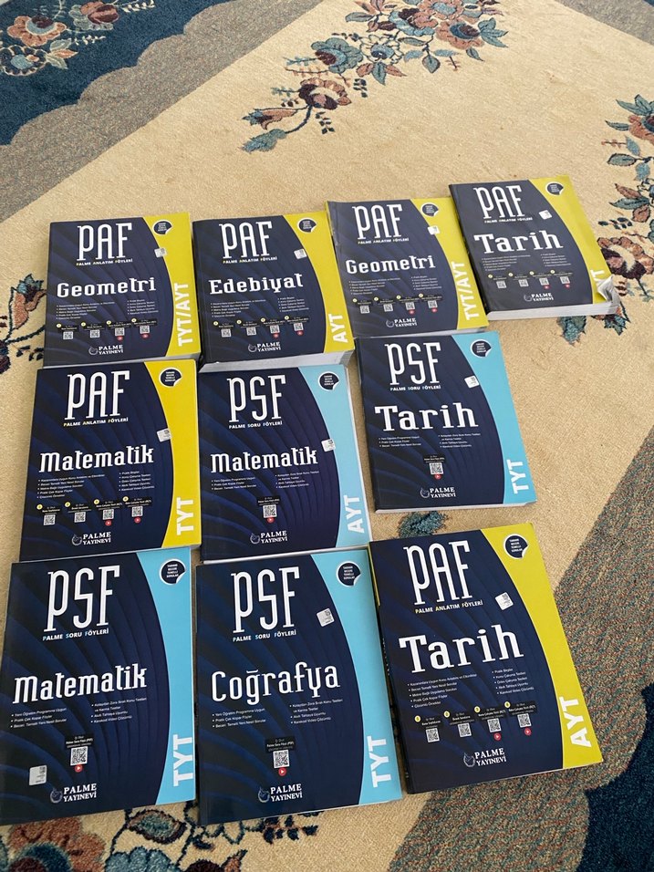 TYT ve AYT sınavları için Tarih, Coğrafya, Geometri, Edebiyat ve Matematik konularını içeren sınav hazırlık kitapları seti.
