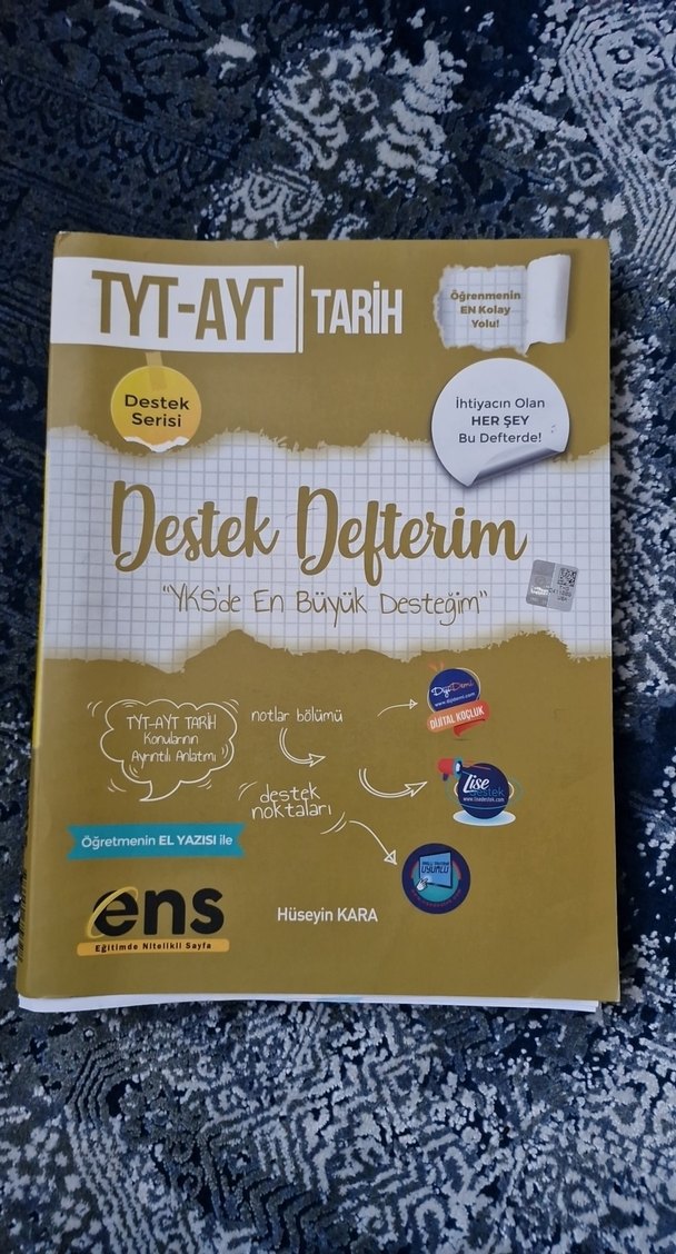 TYT-AYT Tarih konularını ayrıntılı anlatan, notlar bölümü ve destek noktaları içeren Hüseyin Kara'nın eliyle hazırlanmış destek defteri. İçi çok az çizili. Temizdir.