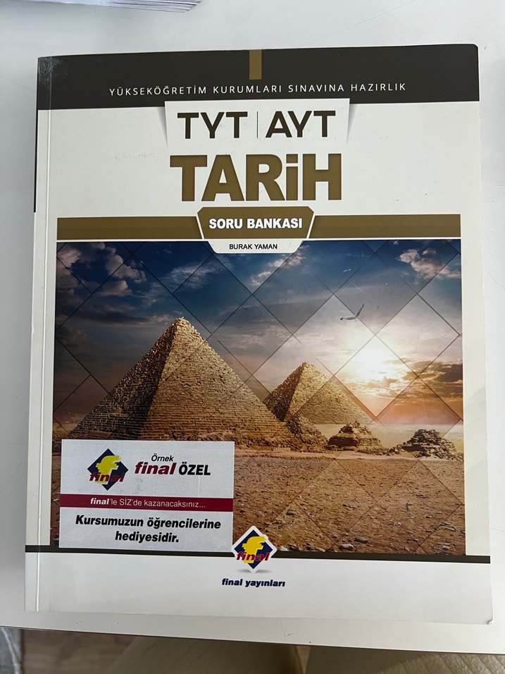 TYT AYT Tarih soru bankası, üniversite sınavına hazırlık için Final Yayınları tarafından hazırlanmıştır. Kurs öğrencilerine hediye olarak sunulmaktadır.